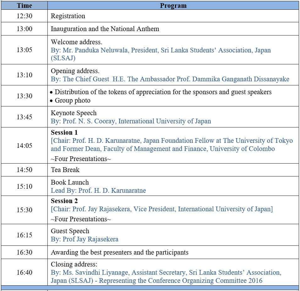 SLSAJ Annual Conference 2016 will be held on 4th of December 2016 at the 4th floor Conference Hall of the Sri Lankan Embassy in Japan from 1.00 p.m on wards.