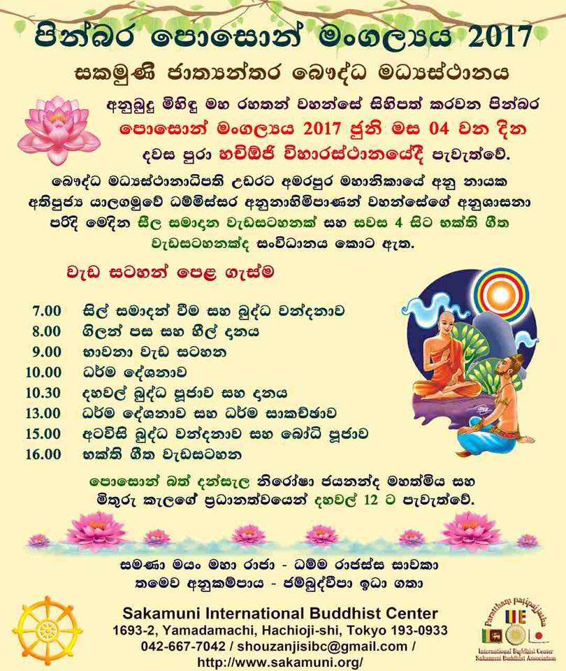 Hachioji Temple-Poson pinkama 25 May 2017 Events, General News More details https://www.facebook.com/Sakamuni.International.Buddhist.Center.Japan/ Share: panduka Administrator Older Post SLAcJ Conference Newer Post National Flood Relief Operations-Embassy of Sri Lanka in Japan