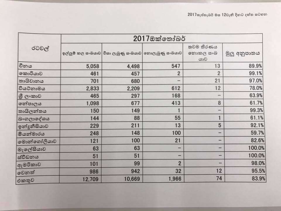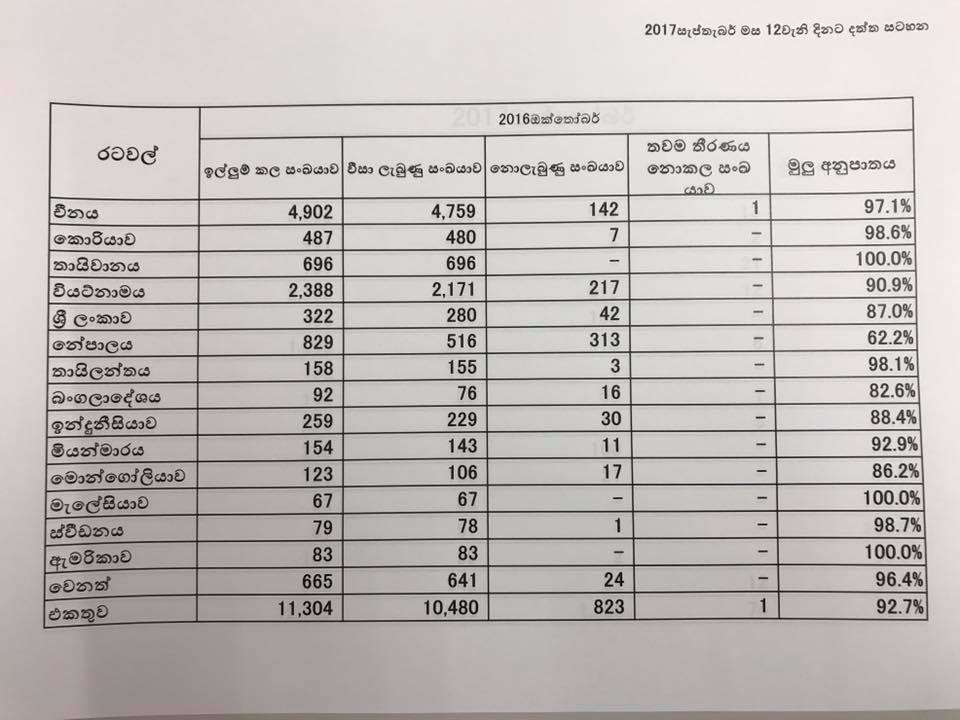 ජපානයට 2017ඔක්තෝබර් සහ 2016ඔක්තෝබර් මස සදහා වීසා ඉල්ලුම් කල රටවල් වල ප්‍රථිඵල ලේඛන සටහන පහතින් දැක්වෙ. මෙම දත්ත සටහන වැදගත් වන්නේ ශ්‍රී ලංකාවෙ සිට ජපානයට ජපන් භෂාව ඉගෙනීමෙ බලාපොරොත්තුවෙන් වීසා ඉල්ලුම් කරන සිසුන්ගෙ සහ නියෝජිතවරුන්ගෙ දැනුවත් වීම පිණිසයි.