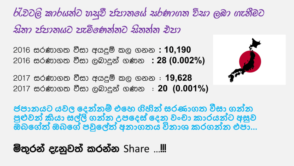 🏵ඔබ ජපානයට එන්න කැමතිනම් රැකියාවක් සොයාගෙන හෝ ජපානයට පැමිණ උත්සහයෙන් ඉගෙනගෙන රැකියාවක් කිරීමට පැමිණෙන්න. shortcuts වලින් එන්නට ගොස් අමාරුවේ වැටෙන්නට එපා…. මිතුරන්ටත් මෙ පණිවිඩය ලබාදෙන්න