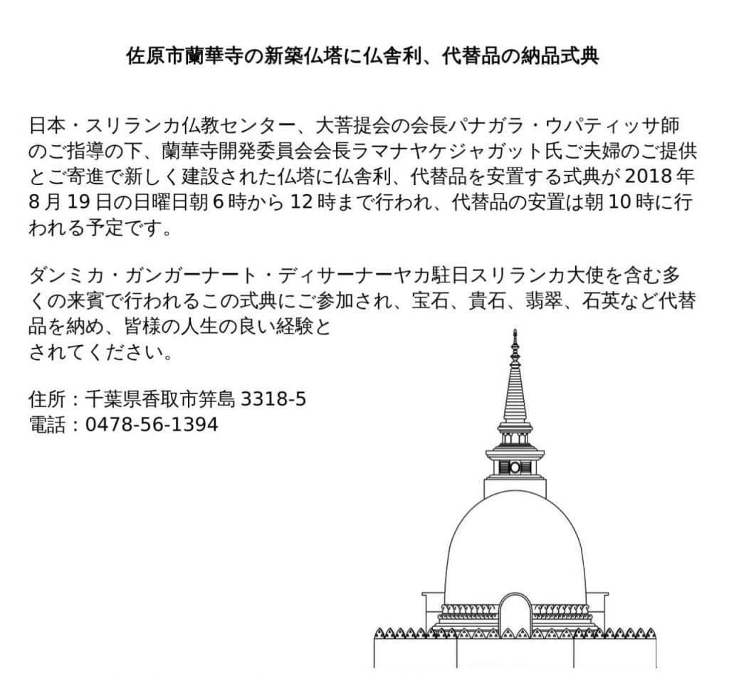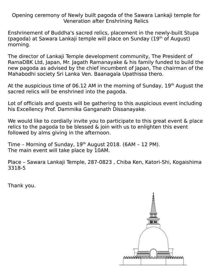 ජපානයේ ශ්රී ලංකා තානාපති තැන්පත් ධම්මික ගංගානාත් දිසානායක මැතිදුන් ප්රමුඛ ගිහි පැවිදි සම්භාවනීය පිරිසකගේ සහභාගිත්වයෙන් සිදුකිරීමට නියමිත මෙම මා හැගි පිංකමට පැමිණ සහභාගි වී පූජා වස්තු නිධන් කොට උතුම් ආශිර්වාදය ලබා ගන්නා ලෙස කරුණිකව අරාධනා කරමු.