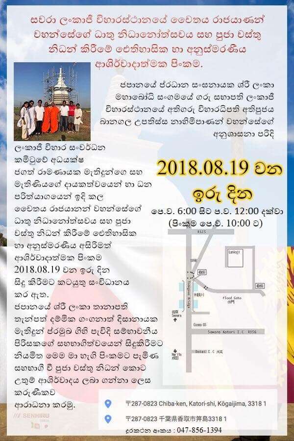ශ්රී ලංකා මහාබෝධි සංගමයේ ගරු සභාපතිල දඹදිව සාංචි චේතියගිරි විහාරාධිපතිල මාලිගාකන්දේ අග්රශ්රාවක මහා විහාරාධිපති හා ලංකාජි විහාරස්ථානයේ විහාරාධිපති ජපානයේ ප්රධාන සංඝනායක අතිපූජ්ය බානගල උපතිස්ස නාහිමිපාණන් වහන්සේගේ අවවාද හා අනුශාසනා පරිදි ලංකාජී විහාර සංවර්ධන කමිටුවේ අධ්යක්ෂ ජගත් රාමණායක මැතිදුන්ගේ මැතිණියගේ සහ දෙමාපියන්ගේ ධන පරිත්යාගයෙන් ඉදි කල රමණීය චෛත්යරාජයානන් වහන්සේගේ ධාතු නිධානෝත්සවය සහ පූජා වස්තු නිධන් කිරීමේ ඓතිහාසිකල අනුස්මරණීය හා අසිරිමත් ආශීර්වාදාත්මක පිංකම